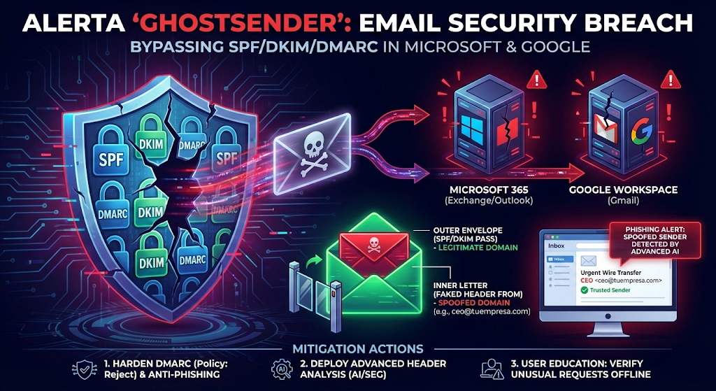 La confianza en el correo electrónico corporativo se ha roto esta mañana. Investigadores de seguridad han revelado la existencia de GhostSender, una vulnerabilidad lógica que afecta a los gigantes del correo en la nube (Microsoft Exchange Online y Google Workspace). Este fallo permite a los ciberdelincuentes enviar correos electrónicos suplantando la identidad de cualquier dominio (incluido el de tu empresa) y, lo que es peor, logrando que aparezcan como «Verificados» y «Seguros» en la bandeja de entrada del destinatario, eludiendo los filtros DMARC.